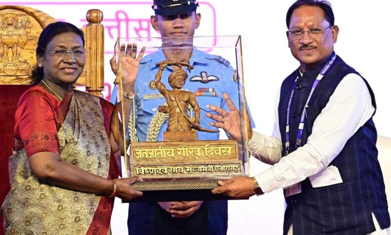 जनजातीय गौरव दिवस समारोह का ऐतिहासिक क्षण : मुख्यमंत्री विष्णु देव साय ने राष्ट्रपति श्रीमती द्रौपदी मुर्मु को भेंट की धरती आबा भगवान बिरसा मुंडा की बस्तर आर्ट प्रतिमा