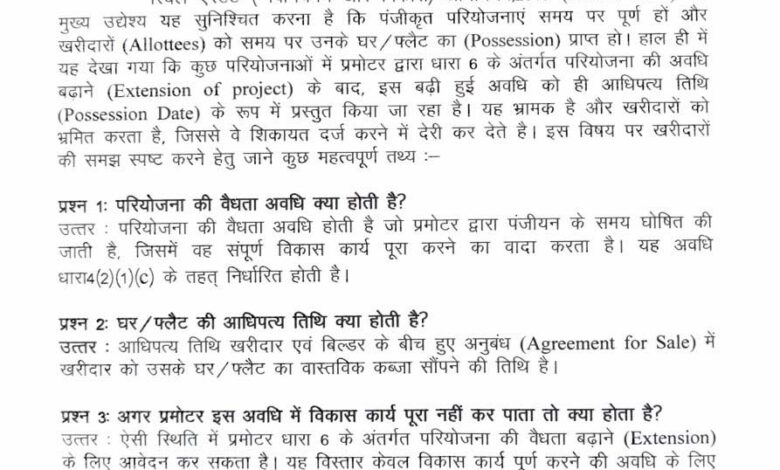 प्राधिकरण ने घर खरीदारों से अपील की है कि वे Agreement for Sale में दी गई आधिपत्य तिथि को ध्यानपूर्वक पढ़ें और किसी भी प्रकार के भ्रम से बचें।