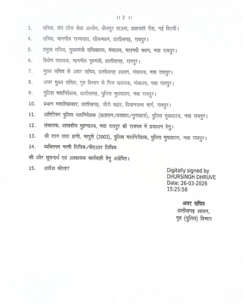 रायपुर। पुलिस महानिरीक्षक रतनलाल डांगी को अखिल भारतीय सेवा(अनुशासन व अपील) नियम 1969 के नियम 3(1)(ए) के तहत प्रदत्त शक्तियों को प्रयोग करते हुए तत्काल प्रभाव से निलंबित कर दिया गया है। निलंबन अवधि में श्री डांगी का मुख्यालय पुलिस मुख्यालय रहेगा व नियमानुसार जीवन निर्वाह भत्ते की पात्रता रहेगी।निलंबन आदेश में इस बात का स्पष्ट उल्लेख है कि श्री डांगी की आपत्तिजनक तस्वीरों के इलेक्ट्रॉनिक और सोशल मीडिया पर तेजी से प्रसारित होने के कारण आम जनमानस और समाज में पुलिस विभाग की छवि काफी धूमिल हुई है। इस अनैतिक कृत्य के लिए रतन लाल डांगी (भा.पु.से.) को व्यक्तिगत स्तर पर पूर्ण रूप से जिम्मेदार माना गया है।