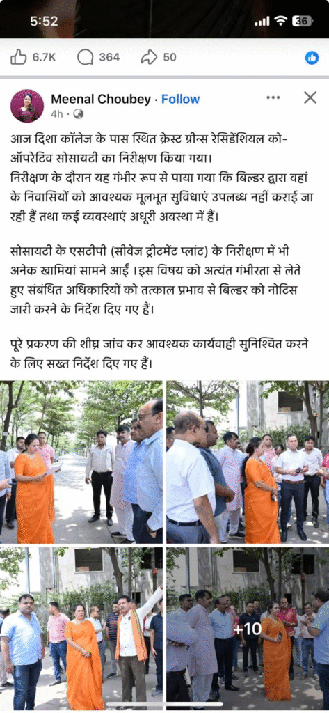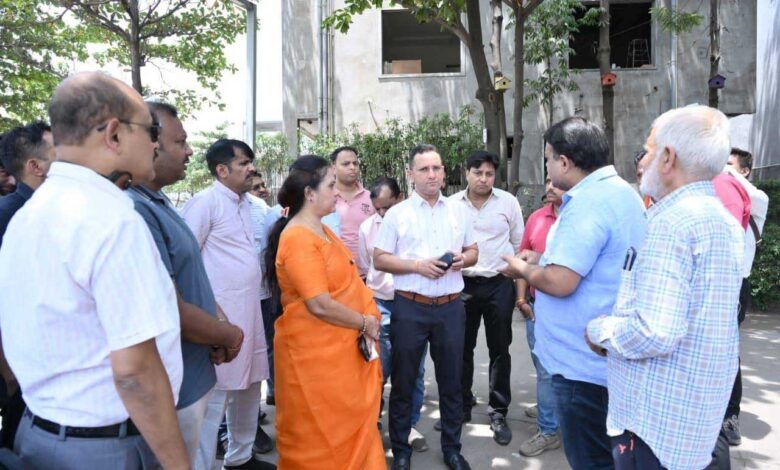 क्रेस्ट ग्रीन सोसाइटी निरीक्षण पर पहुंची महापौर मीनल चौबे लापरवाही के चलते बिल्डर को थमाया नोटिस