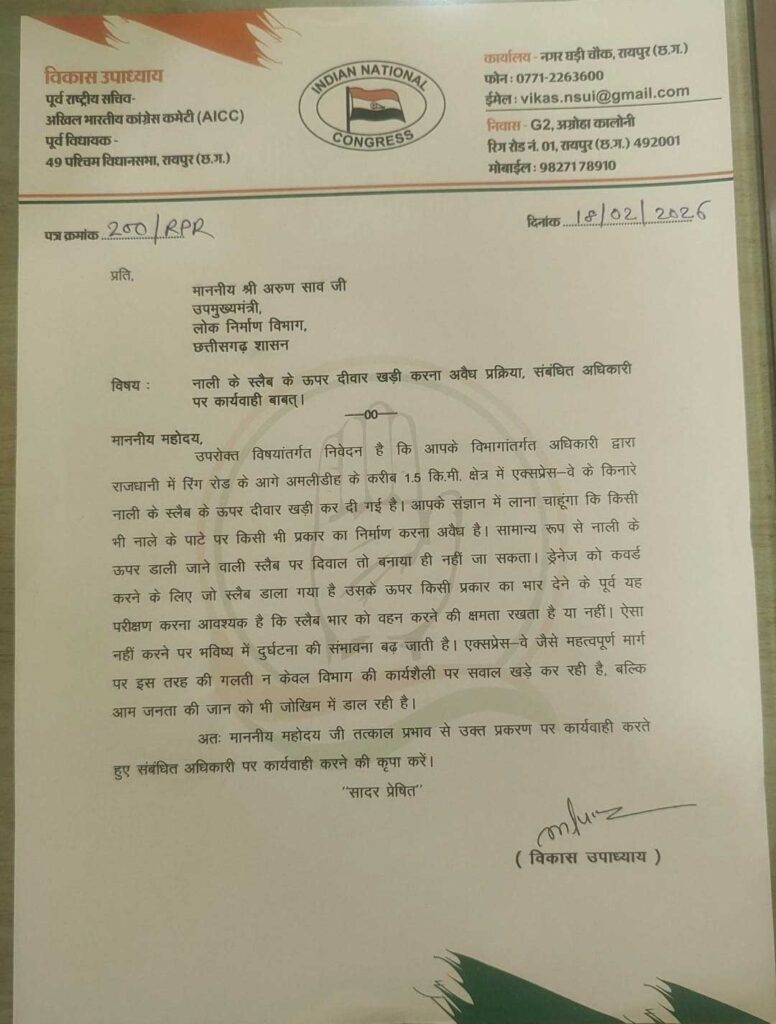 रायपुर । पूर्व संसदीय सचिव एवं छाया सांसद विकास उपाध्याय ने आज उपमुख्यमंत्री अरूण साव जी को पत्र लिखा और बताया कि राजधानी में पीडब्ल्यूडी विभाग द्वारा रिंग रोड के आगे अमलीडीह के करीब 1.5 कि.मी. क्षेत्र में एक्सप्रेस-वे के किनारे नाली के स्लैब के ऊपर दीवार खड़ी कर दी गई है, जो अवैध प्रक्रिया है और तत्काल संबंधित अधिकारी के ऊपर कार्यवाही करनी होगी।
