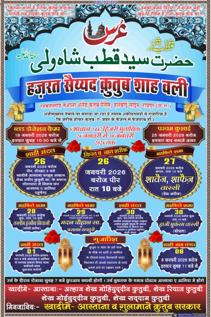 रायपुर :- दिनांक 19 जनवरी – हर साल की तरह इस साल भी हलवाई लाइन स्थित हज़रत सैय्यद क़ुतुब शाह वली र. अ. ( चिराग़ वाले बाबा ) का उर्स मुबारक दिनांक 26 जनवरी से 30 जनवरी 2026 तक मनाया जाएगा।