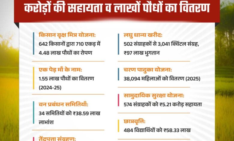 किसान वृक्ष मित्र योजना के अंतर्गत 642 कृषकों ने अपनी 710 एकड़ राजस्व भूमि पर कुल 4 लाख 48 हजार 220 पौधों का रोपण किया। इस योजना ने किसानों को वृक्षारोपण के माध्यम से अतिरिक्त आय का अवसर दिया और खेतों में हरियाली का विस्तार भी किया। इसी प्रकार एक पेड़ माँ के नाम पहल के तहत मातृत्व के सम्मान में 1 लाख 55 हजार 44 पौधों का वितरण किया गया, जिसने समाज में पर्यावरण संरक्षण के साथ भावनात्मक जुड़ाव का नया संदेश दिया।